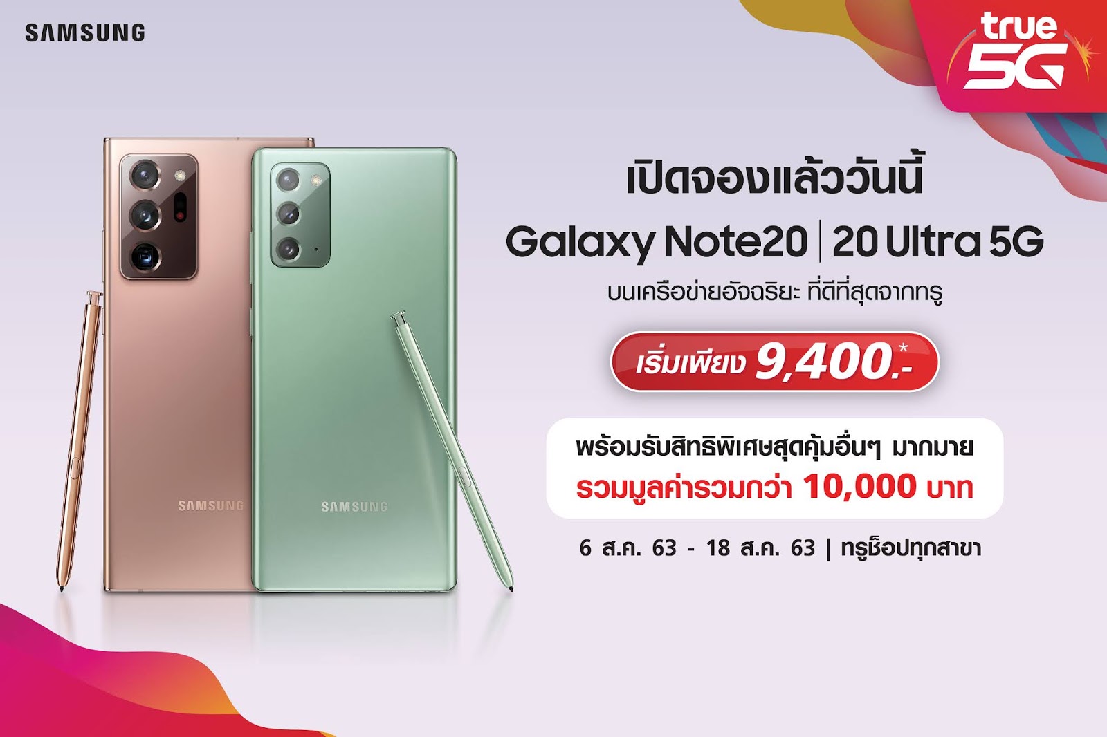 ทรูมูฟ เอช เอาใจสาวกซัมซุง เปิดจอง Samsung Galaxy Note 20|Note20 Ultra แล้ววันนี้ พร้อมสัมผัสสุดยอดประสิทธิภาพการใช้งานไม่มีสะดุด จากการผสานระหว่างเครือข่าย อัจฉริยะทรู 5G และดีไวซ์ 5G สุดล้ำจากซัมซุง ในราคาเริ่มต้นเพียง 9,400 บาท สำหรับลูกค้าทรูแบล็ค ส่วนลูกค้าทั่วไปเริ่มต้นเพียง 13,900 บาท เมื่อใช้คะแนนทรูพอยท์ 5,000 คะแนน พิเศษ! ลูกค้าย้ายค่ายเบอร์เดิม รับส่วนลดเพิ่มสูงสุด 2,000 บาท และเพิ่มความคุ้มค่ายิ่งขึ้นเมื่อนำเครื่องเก่ามาแลกซื้อ Samsung Galaxy Note 20 l Note 20 Ultra ลดอีกทันที 3,000 บาท พร้อมรับโปรโมชั่นสุดเอ็กซ์คลูซีฟจัดเต็มถึง 10 ต่อ อาทิ สิทธิประโยชน์ระดับทรูแบล็ค นาน 1 ปี, รับฟรี Google Nest และ Samsung Clear view cover case, ดูฟรี! ทรูพรีเมียร์ลีกฤดูกาล 2020/21 นาน 10 เดือน ผ่านแอพ TrueID, บริการ True Protech ฟรี 6 เดือน เปลี่ยนมือถือทันใจ มีเครื่องใช้ทันที, ฟรีเน็ตไม่อั้น 12 เดือน สำหรับชม Netfilx และสิทธิพิเศษอื่นอีกมากมาย รวมมูลค่าแถมฟรีกว่า 10,000 บาท เป็นเจ้าของสมาร์ทโฟนสุดล้ำได้ก่อนใคร ตั้งแต่วันที่ 6 - 18 สิงหาคม 2563 ที่ www.truemoveh.com/galaxynote20/preorder ทรูช็อปทุกสาขา, เว็บ True Store, Line @True Store และรับเครื่องได้ในวันที่ 19 - 22 สิงหาคม 2563 ที่ทรูช็อป สาขาที่เลือกไว้