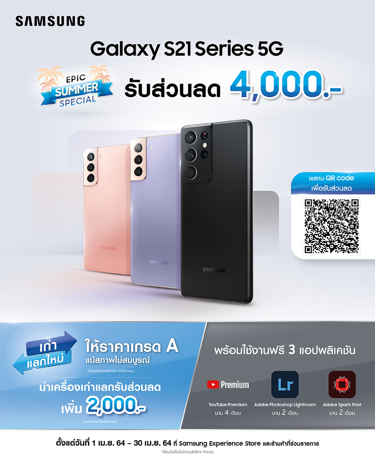 ซัมเมอร์คอลลิ่งแบบนี้ ได้เวลาเตรียมตัวเปลี่ยนสมาร์ทโฟนเครื่องใหม่ ไว้เป็นผู้ช่วยคู่ใจ ไปทริปถ่ายคอนเทนต์ที่ไหนก็ปังได้แบบไม่มีพลาด ซึ่งช่วงเวลาแบบนี้ ซัมซุงได้ส่งโปรโมชั่นใหม่ล่าสุดมาเอาใจสายทำคอนเทนต์ กับ “Epic Summer Special” ที่มอบส่วนลดมูลค่า 4,000 บาทให้ทันที เมื่อซื้อ Samsung Galaxy S-21 Series 5G ทุกรุ่น และพิเศษต่อที่สองกับแคมเปญ ‘เก่าแลกใหม่’ ที่ซัมซุงจัดให้ในราคาเทียบเท่าเครื่องเกรด A และยังให้ส่วนลดเพิ่มเติมอีกถึง 2,000 บาท แม้สภาพไม่สมบูรณ์ สำหรับผู้ที่นำสมาร์ทโฟนเครื่องเก่าในรุ่นที่กำหนดมาแลกซื้อสินค้า ตั้งแต่วันนี้ – 30 เมษายนนี้เท่านั้น ที่ Samsung Experience Store และร้านค้าที่ร่วมรายการ